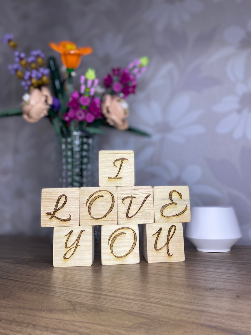 Özel tasarımıyla dikkat çeken “I Love You” lazer yazımlı dekoratif ahşap küpler, evinizin veya ofisinizin atmosferini zenginleştirir.
